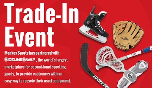 Athletes receive a quote from SidelineSwap for gear that meets the trade-in guidelines and, upon acceptance, they will be issued a MonkeySports gift card. Sometimes there are added incentive bonuses that give you a chance to earn more cash for your trade-in, be sure to ask a MonkeySports associate.